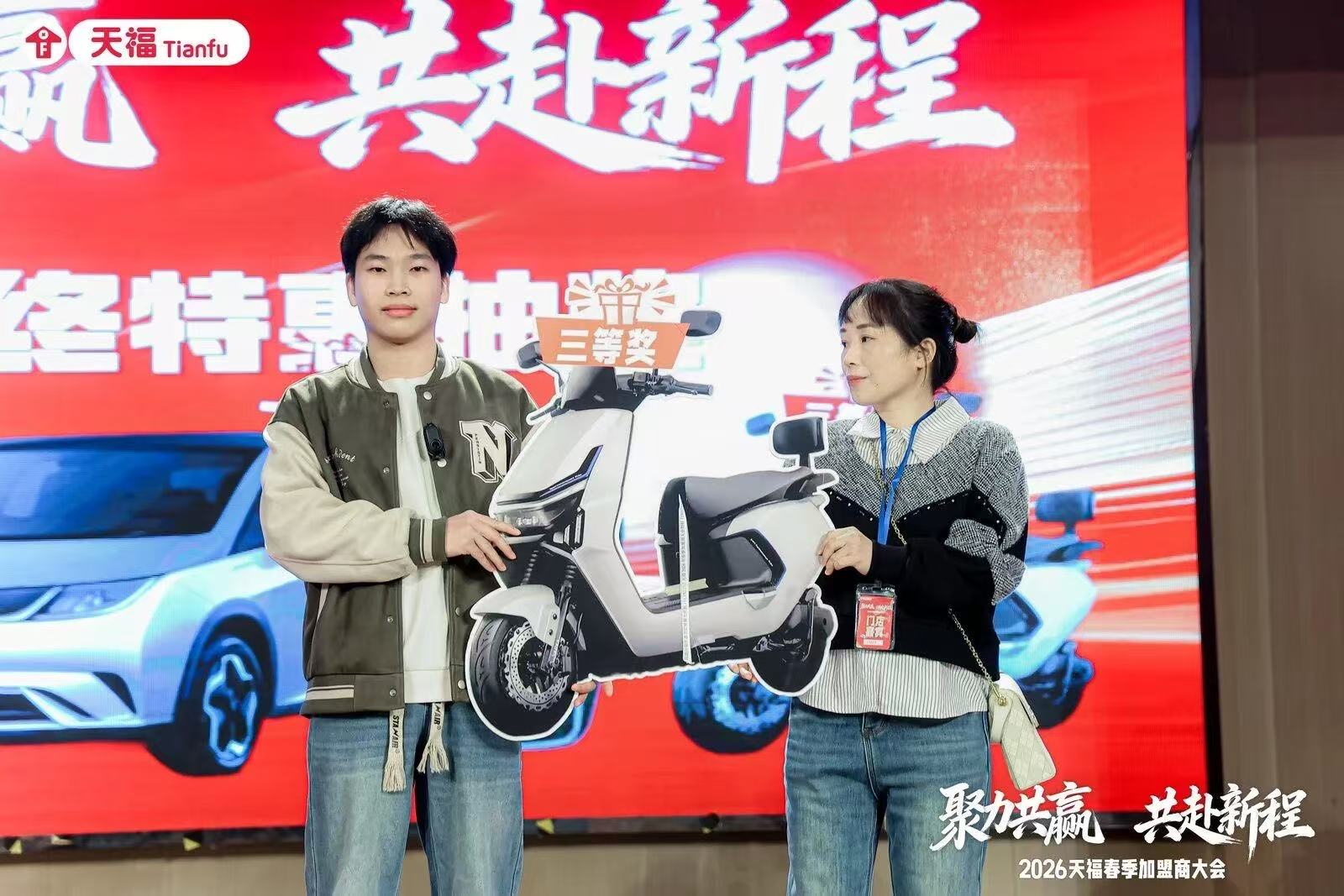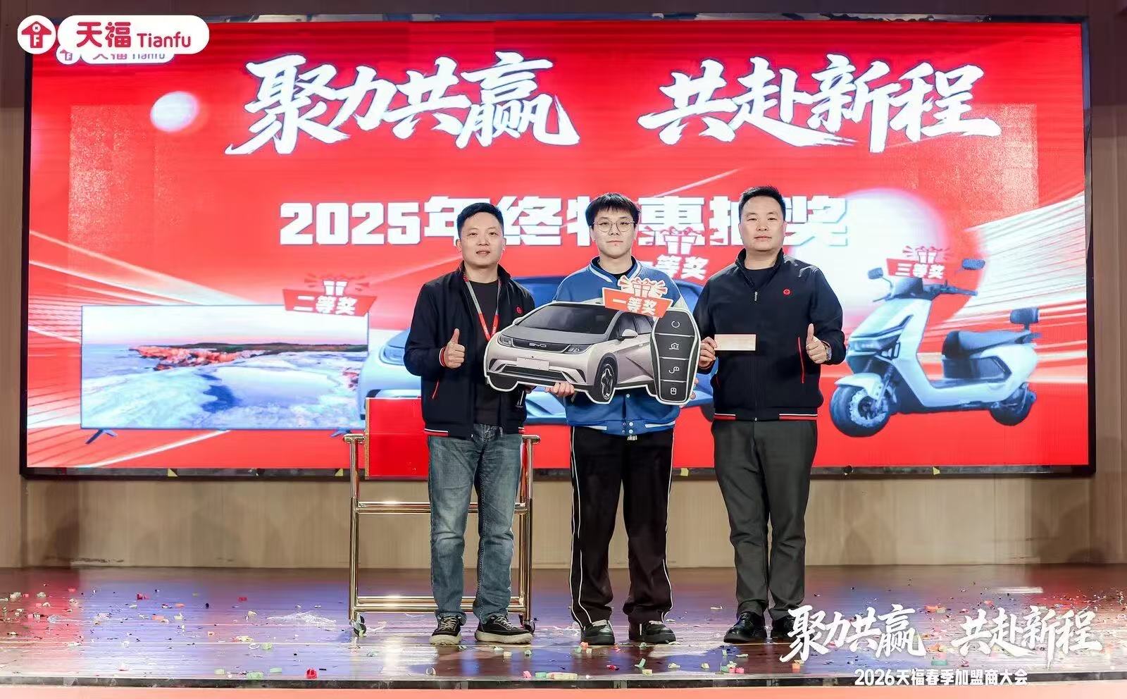 本次大会以备受瞩目的“满额报货门店抽汽车”活动为核心亮点。为回馈长期以来信赖、支持天福的广大加盟商,天福集团准备了1台价值8万元的比亚迪汽车、10台价值3500元的品牌电视机、20台价值2500元的品牌电动车等丰厚实物奖励。通过此类高价值、实物化的加盟商激励方式,天福正用诚意践行“聚力共赢”理念,为行业树立起务实回馈的新范例。